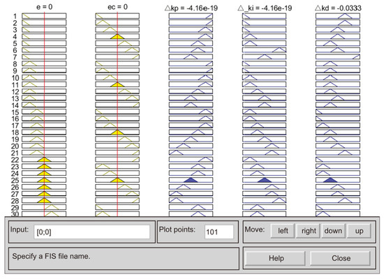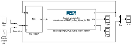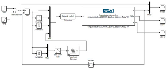After establishing the fuzzy rules, a PID controller structure with fuzzy adaptive components was constructed in Simulink using the co-simulation interface, as shown in Figure 24:
