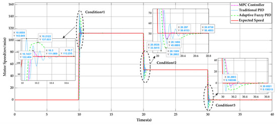 The statistical data reveal that during the continuous speed change processes within Conditions #1 and #2, the traditional PID controller no longer meets the control performance requirements in terms of overshoot indicators. While both the fuzzy PID and MPC controllers perform similarly in steady-state parameters, the MPC controller exhibits superior overshoot indicators compared to the fuzzy PID in both acceleration and deceleration conditions. Furthermore, during the deceleration to a stop in Condition #3, the MPC process demonstrates smoother control with minimal oscillation, ultimately achieving the most effective control.