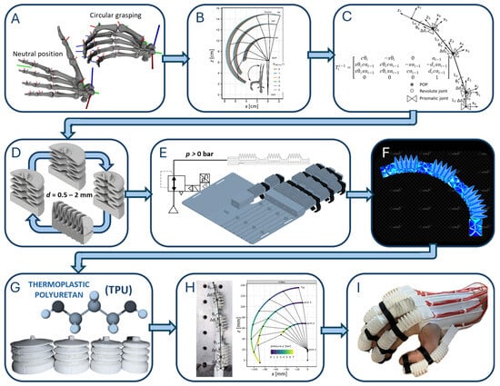 The process of design, development, and experimental assessment of the rehabilitation glove: (A) circular grasping example; (B) finger ROM; (C) finger kinematics; (D) tuning of construction parameters in the design process; (E) final 3D model; (F) SOFA simulation; (G) 3D-printed segments made from TPU, featuring varying dimensions and wall thicknesses for design analysis; (H) experimental assessment and validation of the soft robot’s ROM; and (I) the developed rehabilitation glove fitted onto the user’s hand.