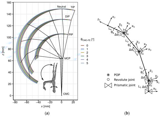 As a basis for the kinematic modeling of soft robot actuators, we use results from our previous work [16], which presents a detailed kinematic analysis of the anthropometric hand model encompassing inter- and intra-joint constraints and implementation in an open-source environment. Four fingers—the index (I), middle (M), ring (R), and little (L)—were represented using a single kinematic tree with different parameters and constraints (see [16]). Joint parameters were obtained using a modified DH approach, and a reachability analysis of the fingers’ workspace was performed. Kinematic trajectories for I finger anatomical joints—carpometacarpal (CMC), metacarpophalangeal (MCP), proximal interphalangeal (PIP), distal interphalangeal (DIP), and fingertip (TIP)—in the flexion-extension (FE) plane are depicted in Figure 2a.