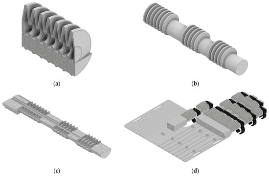 Building on the advantages of various geometric shapes in soft pneumatic actuators, as highlighted by Marchese et al. [19], we developed a hybrid design solution for the rehabilitative glove’s actuator. This design combines cylindrical and ribbed geometries with a constraining element in the form of a thicker, less extensible structure. The result is a cylindrical bellow actuator with an asymmetrical shape, featuring a reinforced layer on one side. A cross-section of one segment is shown in Figure 3a. As previously mentioned, the I, L, R, and M fingers require the actuation of three joints (see Figure 3b), leading to a design that incorporates three actuator segments and cylindrical components corresponding to the finger’s phalanges. Figure 3c illustrates the cross-section of the model, showing all three sections along with channels for the delivery of pressurized air to each segment. To ensure the supply of compressed air to each actuator segment, cylindrical channels connect the actuators to the pneumatic supply pipes, with the connection achieved using a sealant. To ensure ergonomic and soft contact between the glove actuator and the human fingers, a rounded groove is designed on the side of the actuator featuring flat geometry. Grooves are incorporated into the cylindrical segments to accommodate ring-shaped elements, facilitating the transfer of force and movement from the actuators to the fingers. A supporting element that secures all the actuators in position and attaches the device to the human hand is depicted in Figure 3d. The glove’s supporting element is designed to be flexible, allowing it to adapt to the human hand. It features triangular protrusions that facilitate positioning and create a secure fit with the finger actuators. Additionally, the support element features holders that guide the pneumatic tubes, ensuring they are correctly positioned and integrated as part of the glove. On the interlocking side of the actuator, a prismatic segment with triangular protrusions and grooves has been designed to connect the actuators to one another and to the support element. The dimensions of each soft actuator are given in Table 2.
