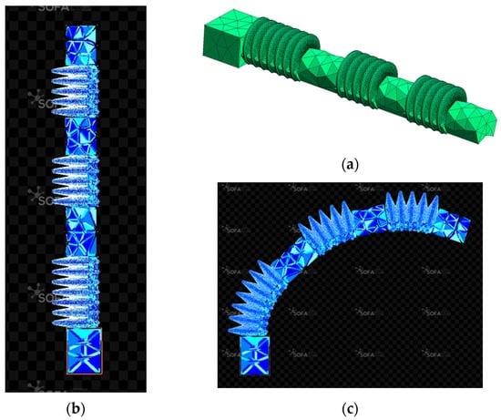 The algorithm for simulating the soft actuator is written in Python, using the SofaPython3 (https://sofapython3.readthedocs.io/en/latest/, accessed on 21 November 2024) extension alongside the standard software package to develop simulations. The actuator simulation process begins with discretizing the soft actuator into a volumetric mesh of tetrahedrons, accomplished using the Gmsh (https://gmsh.info/, accessed on 21 November 2024) tool. This tool generates a .vtk file that contains information on node positions and their connectivity. The volumetric mesh of the actuator model is shown in Figure 4a. The mesh is then imported into the Mesh component, and a MechanicalObject component is created to define the DOFs for the actuator’s movement.