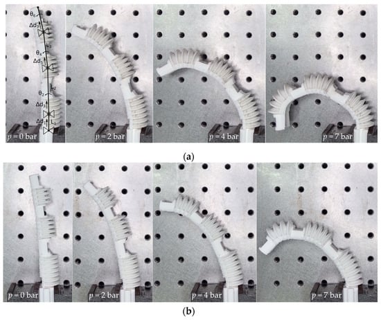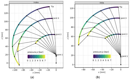 Figure 6 provides examples of bending for the little and index finger actuators at 0, 2, 4, and 7 bar. Figure 6a additionally shows the overlaid schematic with kinematic parameters on the physical actuator’s initial position (p = 0 bar).