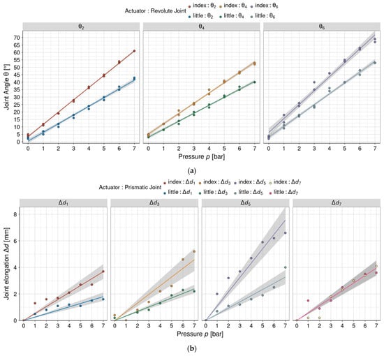Next, a regression study was performed on the measured joint angles θi and link elongations Δdi to assess their correlation with pressure in all three actuator cylindrical segments across both fingers. The experimentally obtained data and the corresponding linear regression analysis for the index and little fingers, which represent changes in joint angle and link elongation as a function of pressure across all three cylindrical actuator segments, are shown in Figure 7a,b, respectively.