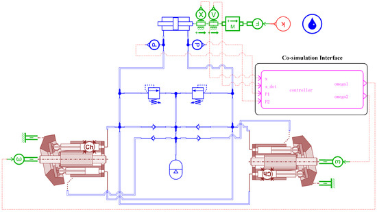 Meanwhile, an adaptive backstepping control algorithm is established in MATLAB Simulink based on the model and used as a controller in the simulation of the EHA system. The control algorithm can effectively address the inherent nonlinearities in the hydraulic system and ensure accurate motion control under different load and speed conditions. Subsequently, a compiler is used to link the two platforms for real-time data exchange between AMESim and Simulink for co-simulation. In this process, the physical model of the EHA system built in AMESim transmits the displacement, velocity, and pressure data of the two chambers to Simulink as feedback signals, and the control algorithm calculates the required pump speed according to the reference trajectory of the system. Finally, the calculated pump speed is sent back to AMESim so that the hydraulic system can be adjusted instantaneously during the simulation.