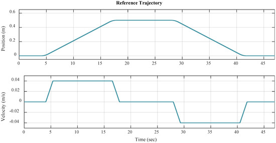 As shown in Figure 5, the simulation tests the control strategy using a smooth point-to-point S-curve reference trajectory as the desired trajectory in the simulation. The trajectory was designed to have a maximum displacement of 0.5 m, which was used to ensure a thorough evaluation of the ability of the system to track displacement. The maximum velocity of the trajectory is set to 0.04 m/s and the maximum acceleration is set to 0.03 m/s2. This will test the micromotion capability of the EHA system at low-speed operation.