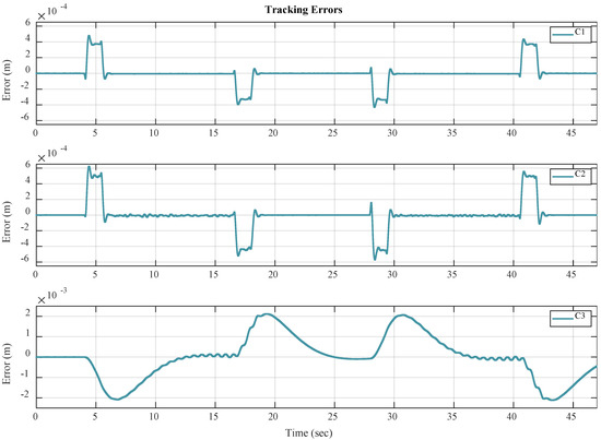 The simulations compare the effects of three different control algorithms and operating modes on the performance of the EHA system. The results demonstrate the performance of each scheme in terms of the steady-state tracking accuracy, localization error, dynamic response, and system stability. The tracking errors of each scheme are shown in Figure 6, Figure 7 and Figure 8.