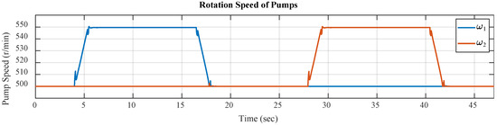 In contrast, C2 (dual-pump, synchronized-speed, and same-steering operating mode using an adaptive backstepping control algorithm) experiences crawling when the actuator operates at low hydraulic cylinder speeds. This occurs because low pump speeds in the second mode of the EHA lead to greater flow variability and reduced stability. Figure 8 depicts the pump speeds in the C2 mode; both pumps have the same speed and steering, and each carries half of the output flow. Unlike C2, the real-time adaptability of C1 significantly improves the dynamic response and precision. In comparison, the traditional parallel flow mode of C2 performs poorly in the speed–flow nonlinear region, particularly at low actuator speeds, resulting in higher steady-state errors.