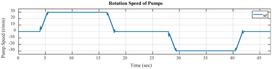 In this paper, in the operating mode, so that the two pumps in standby are maintained at a certain speed, each piston pump only adjusts the speed change, as shown in Figure 7; at this time, the internal parts of the piston pump have generated an oil film, lubrication is good, the friction situation is in line with the modeling of this paper, the pump is more efficient, the flow rate of the piston pump to follow the speed of the change in the linearity is also better, and due to the characteristics of the bi-directional piston pump, the speed interval and the bi-directional flow symmetry of forward and reverse rotation of the piston pump are also higher, so the performance consistency of the actuator in micro-actuation during extension and retraction is also satisfied. As shown in Figure 6, from 6 s to 16 s and from 30 s to 40 s under C1, the actuator operates with minimal error, and the hydraulic cylinder shows no signs of crawling or other undesirable phenomena.