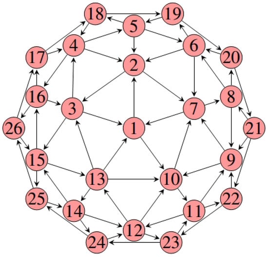 A digraph with 26 nodes. Here, the red circles represent network nodes, and the arrows indicate the connection between the edges of the digraph.