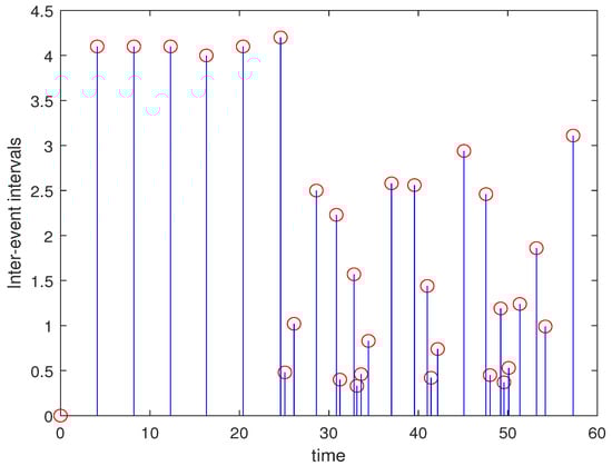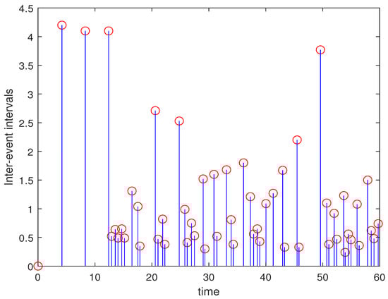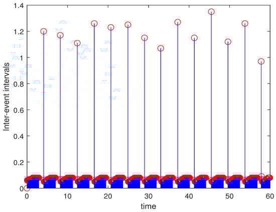 The triggering times under an intermittent dynamic event-triggered control strategy (32) with and . The blue line with a red circle represents the time interval between adjacent triggering moments.