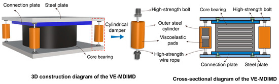 The novel VE-MDIMD proposed in this paper is illustrated in Figure 1. The device is composed of steel plates, steel connection plates, a core bearing, and cylindrical dampers. The steel plates, which are used to connect the device to the structure and foundation, are positioned at the top and bottom of the device. The core bearing is located at the center of the device, and can be either a rubber isolation bearing or a high-damping viscoelastic isolation bearing. The steel connection plates are situated at the upper and lower ends of the core bearing. The connection plates are integrally vulcanized with the core bearing and are attached to the steel plates through high-strength bolts. The cylindrical damper is arranged around the core bearing and consists of four main components: an outer steel cylinder, cylindrical viscoelastic pads, high-strength bolts, and high-strength wire ropes. The viscoelastic pads serve as the device’s primary energy-dissipation element, while the wire ropes are applied to transmit force between the cylindrical damper and the core bearing. Under seismic loads, the viscoelastic pads dissipate the input energy through the cyclic compressive deformation induced by the wire ropes. The high-strength bolts are used to connect the cylindrical dampers to the core bearing of the VE-MDIMD. By adjusting the high-strength bolts, the cylindrical dampers can be appropriately pre-tensioned to achieve a suitable initial stiffness.