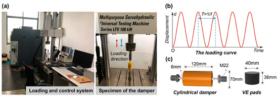 As mentioned above, the cylindrical damper is the core energy-dissipation component of the VE-MDIMD. Additionally, the damper is the part of the device with the most complex mechanical characteristics. Therefore, a series of mechanical property tests were conducted on the cylindrical damper in which it was subjected dynamic cyclic loads with different frequencies and amplitudes to help understand the performance of the VE-MDIMD. The tests were performed on a hydraulic servo fatigue machine at the China-Pakistan Belt and Road Joint Laboratory on Smart Disaster Prevention of Major Infrastructures at Southeast University, China. The test machine had a maximum loading capacity of 100 kN and a displacement stroke from −60 mm to +60 mm. The loading and data acquisition processes for the tests were controlled by the same computer. To keep the test results consistent with the performance of the actual device, the cylindrical damper in the test was installed vertically and connected to the actuator of the loading machine through a pair of connecting rods and high-strength bolts. The experimental system is presented in Figure 2.