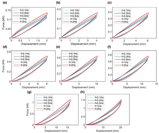 Figure 3. The force–displacement hysteresis curves of the cylindrical damper under different frequencies: (a) d = 2 mm; (b) d = 4 mm; (c) d = 6 mm; (d) d = 8 mm; (e) d = 10 mm; (f) d = 12 mm; (g) d = 16 mm; (h) d = 20 mm.