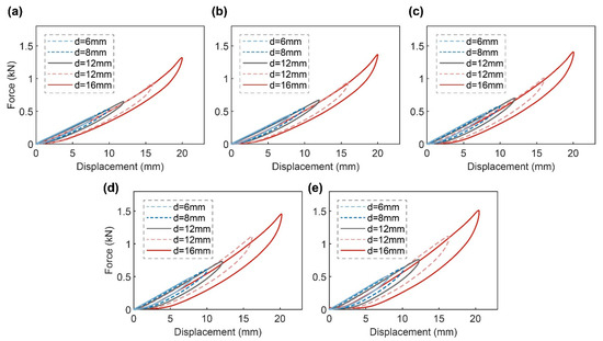 Figure 4. The force–displacement hysteresis curves of the cylindrical damper under different amplitudes: (a) f = 0.1 Hz; (b) f = 0.2 Hz; (c) f = 0.5 Hz; (d) f = 1 Hz; (e) f = 2 Hz.