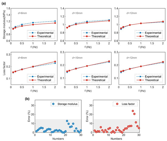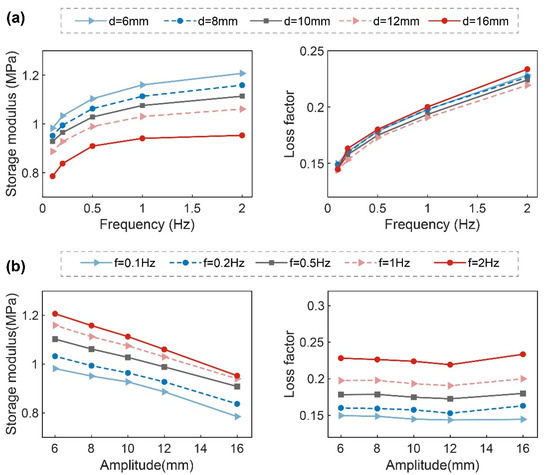 Figure 5. The equivalent mechanical property parameters under different loading conditions: (a) the variation in equivalent storage modulus and loss factor with frequencies; (b) the variation in equivalent storage modulus and loss factor with amplitudes.