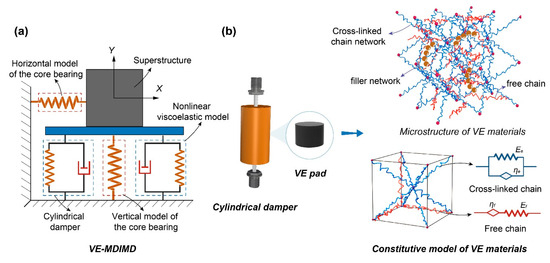 A promising approach to designing an effective MDIMD with relatively simple construction is to introduce viscoelastic damping technology [48,49,50]. Recently, several MDIMDs using viscoelastic materials have been proposed to address vibration issues in building structures [51], long-span structures [52], long-span pipelines [53], high-speed railway bridges [54], etc. However, many studies indicate that viscoelastic materials have complex mechanical properties associated with excitation frequencies and deformation amplitudes [55,56,57]. In addition, a strong nonlinear hysteresis behavior is also found in this material under a finite deformation range [58,59]. Constitutive models for characterizing the dynamic behavior of viscoelastic materials are divided into two categories: rheological models and multi-scale models. Rheological models use the combination of spring and dashpot elements, such as the traditional Kelvin and Maxwell models, the Zener model [60,61], and the fractional-derivative models [62,63]. These models are effective in predicting the frequency effect of the material, and some of them are modified to reflect the influences of amplitudes and ambient temperatures [64]. On the other hand, multi-scale models are established based on the microscopic molecular structure of viscoelastic materials. This modeling approach creates a connection between the physical chain structure and the macroscopic mechanical behavior of viscoelastic materials [65,66]. Therefore, many of the macroscopic nonlinear characteristics of the material, including its rate dependency [67], Payne effect [68], and aging damage [69], can be accurately interpreted. However, most existing viscoelastic models are established in the linear deformation range, where the material’s hysteresis curve is assumed to be an ideal elliptical curve. Although the effectiveness of these models has been evaluated through many experiments, few of them have the capacity to fully capture the frequency- and amplitude-dependent hysteresis behavior of viscoelastic materials in the nonlinear deformation range.