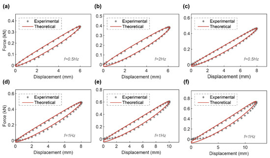 To better understand the mechanical properties and energy-dissipation mechanism of the cylindrical damper, the test data were processed using Matlab software to obtain the force–displacement hysteresis curves. To eliminate the Mullins effect of viscoelastic materials, the stable hysteresis curves from the third loading cycle were selected for analysis. As seen in Figure 3, the hysteresis curve of the cylindrical damper in all tests shows a large enclosed area, indicating that the damper has a strong energy-dissipation capacity. Additionally, as the frequency increases, both the slope angle and the enclosed area of the hysteresis curves gradually increase, demonstrating that the stiffness and energy-dissipation capacity of the damper are enhanced by excitation frequencies. Furthermore, at all loading frequencies, the force–deformation hysteresis curves of the cylindrical damper return to their origin, indicating that the deformation of the damper can fully recover after the external force is removed. The results confirm that the damper has excellent deformation and self-centering abilities.