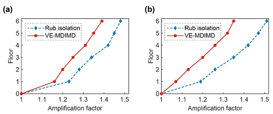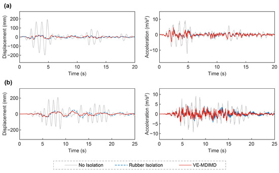 The dynamic analysis results based on the optimal arrangement of the VE-MDIMDs indicate that the horizontal displacement responses, the horizontal acceleration responses, and the inter-story drift values of the structure are significantly reduced. Additionally, compared to the rubber isolated structure, the maximum displacement of the isolation layer in the structure with the VE-MDIMDs is also significantly decreased. Furthermore, under vertical earthquake conditions, the amplification factors of dynamic responses in the structure with the VE-MDIMDs are apparently smaller than those in the structures with conventional rubber isolations. Therefore, dynamic analysis suggests that the novel VE-MDIMD can perform effectively in both the horizontal and vertical directions.
