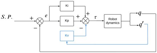 This subsection examines the development of the PI-V controller for the robot. It is worth mentioning that the development of this controller does not apply to the entire robot, which is developed as a controller for each degree of freedom. In short, there are four PI-V controllers, and each controller has different gains because the force required by each motor is very different because some links carry more weight. The representation of the closed-loop system can be seen in Figure 1.