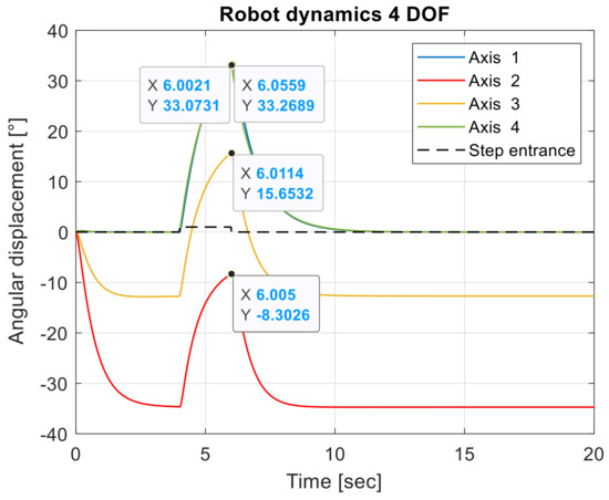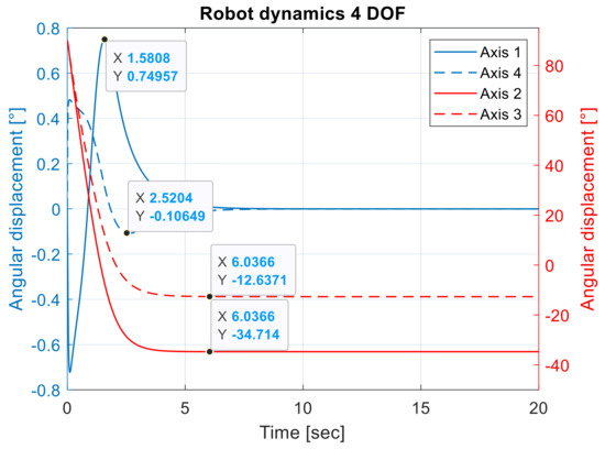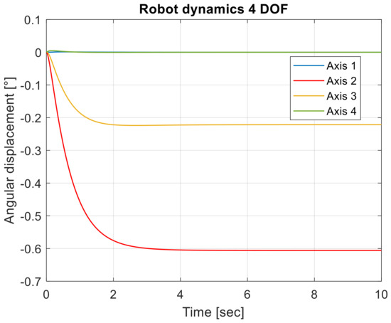 The distances between the robot links are listed in Table A1, which is found in Appendix A, Section 2. One of the first objectives is to determine how the simulation of the robot behaves when no force is applied to it and its robot positions are zero (initial conditions or steady state). This behavior is seen in Figure 3, where axis 1 remains at zero, axis 2 has an angular displacement of −0.6° due to the weight of the other links, and in a very similar way, occurs with axis number 3, which has a small angular displacement of approximately −0.2°. Axis 4 stays at approximately zero degrees.