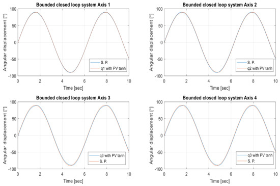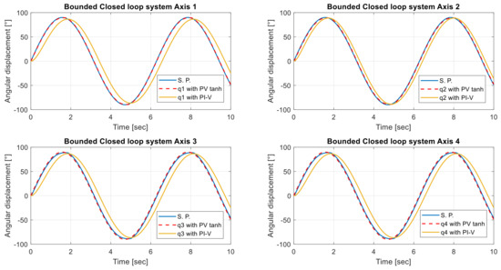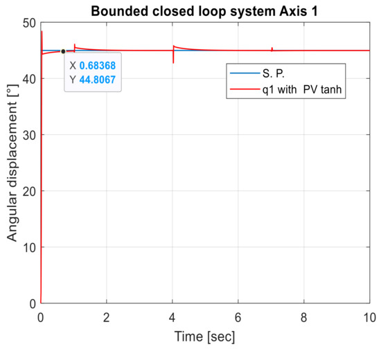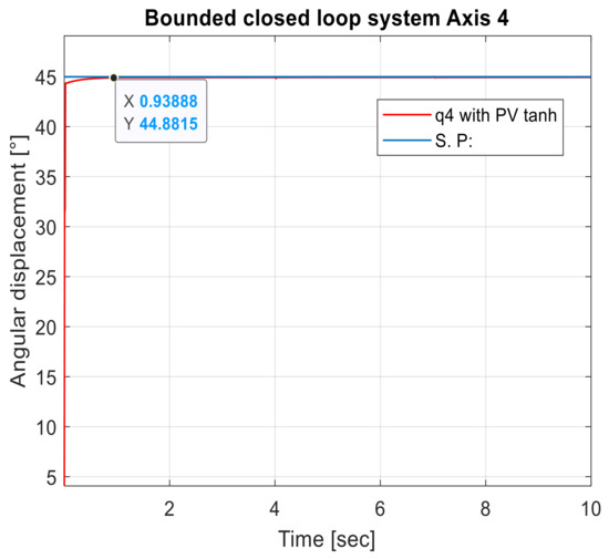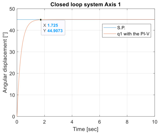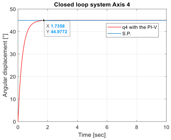 Finally, the response of axis 4 is shown in Figure 9, where its response time is approximately 2 s with a reference value of 45°.