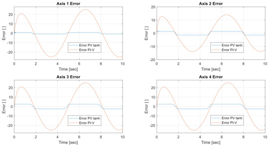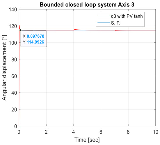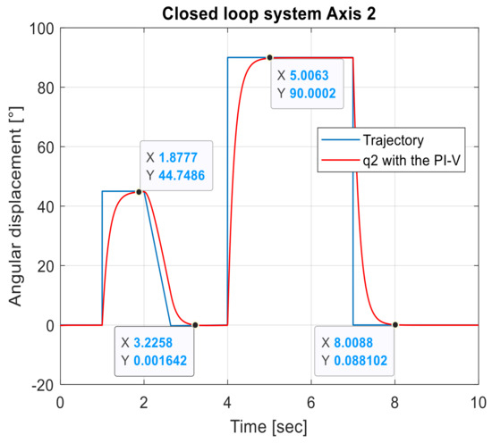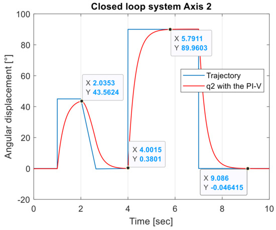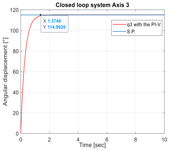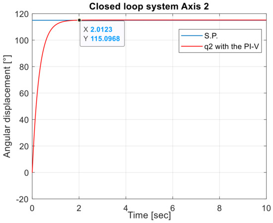 For axis 2, the response of the system with the controller in Figure 7 shows that the reference angle we are looking for is 115°, which is approximately 2 s. It is worth mentioning that one of the most complicated axes to control is axis 2, which is due to all the weights falling on this axis.