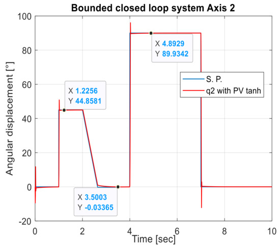 It is worth mentioning that the reference values were placed randomly, even in extremely complicated positions for axes 2 and 3, where the maximum load was generated. An example of this is shown in Figure 10, which tracks the trajectory where there are two-step functions in very short periods of time. In the first step, because of the interval time of said function, it does not reach the reference value, which is 45°; in the second step, it manages to reach the reference value with a response time of 1.7 s.