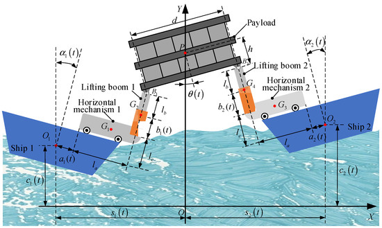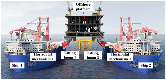 Dual marine lifting systems (DMLSs) are commonly utilized for the transportation and installation of large-scale offshore platforms. As shown in Figure 1, large offshore platforms require lifting by two lifting booms that can move linearly along the horizontal mechanisms. The DMLS is installed on two ships to carry out offshore lifting operations. It is evident that the offshore platform’s swing is caused by inappropriate control commands for DMLS under sea wave disturbances. The undesirable swing of the offshore platform decreases the safety and productivity of operational tasks [1]. Therefore, it is crucial to design an efficient control approach for DMLSs subject to sea wave disturbances.