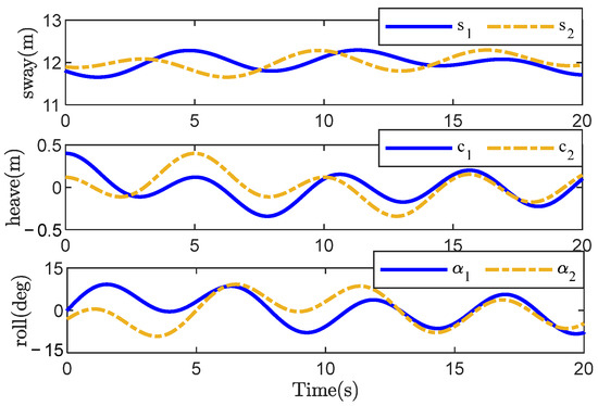 The system parameters of the DMLS simulation platform and control gains are given in Table 2. The sway, heave, and roll motions induced by sea wave disturbances in dual ships were calculated utilizing the Marine System Simulator (MSS) toolbox [48]. Figure 4 and Figure 5 show the sea state and the ship motions, respectively.