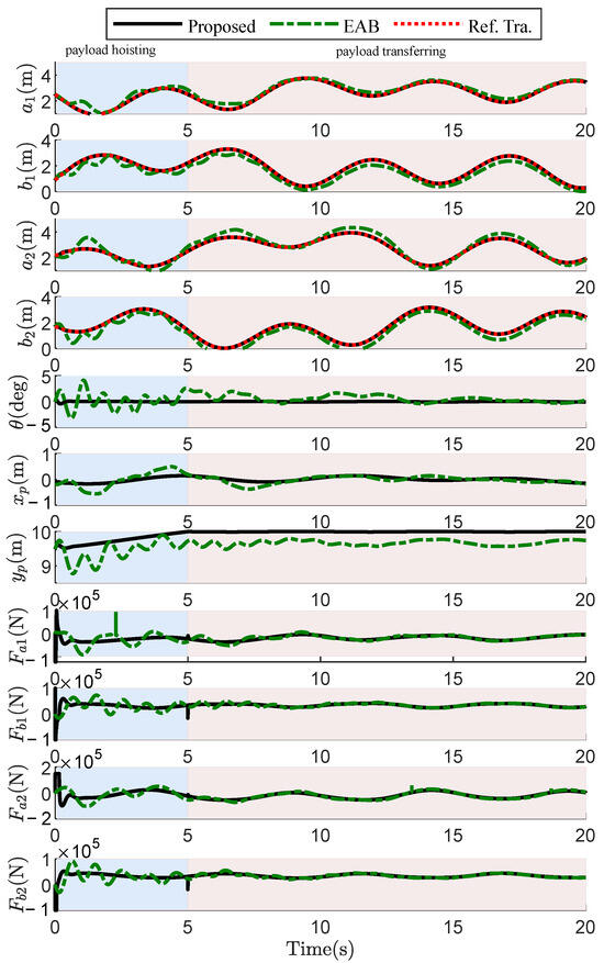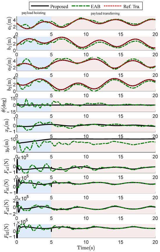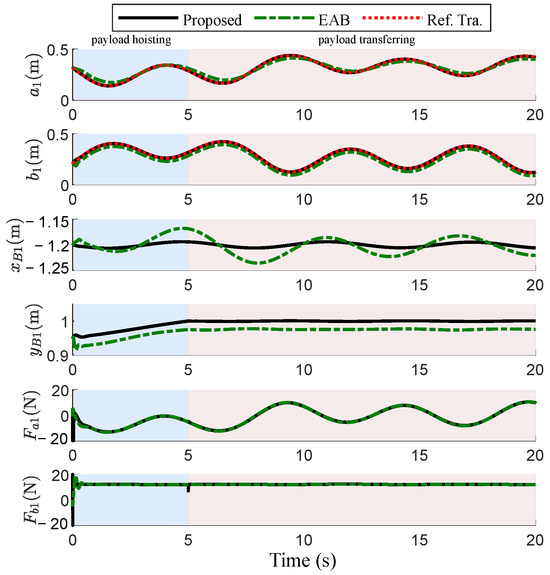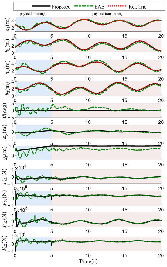 This simulation compares the proposed controller with the EAB controller [36]. To enhance the ease of comparison, the proposed controller and EAB controller track the same reference trajectories (Ref. Tra.), which are designed in (14)–(17). The target position of the payload is set as P (0, 10).
