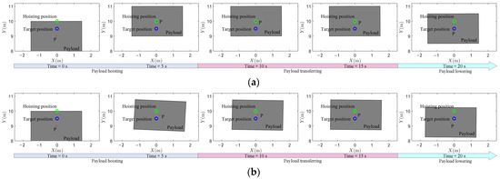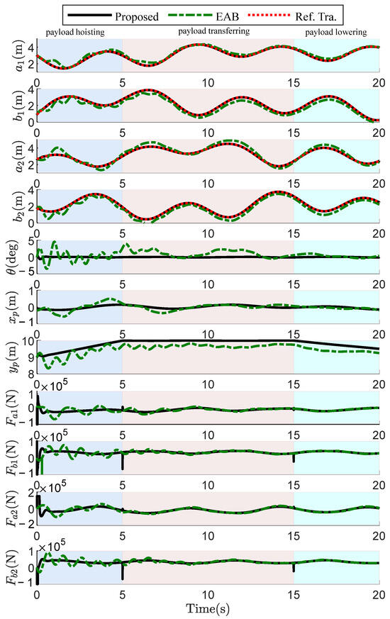 Figure 6 presents the comparative simulation results of the proposed controller and EAB controller. When using the EAB controller, the payload has a maximum positioning error of 0.372 m in the X direction and 0.433 m in the Y direction. The maximum swing angle of the payload is 4.83 deg. There is residual swing for a long period of time. However, it is observed that the proposed controller drives the horizontal mechanisms and the lifting booms to reach reference trajectories accurately. Under the proposed controller, the positioning errors of the payload in the X and Y directions are only 0.036 m and 0.006 m, respectively. The swing angle of the payload is suppressed and converges to zero when using the proposed controller. Figure 7 depicts the payload position and attitude during the hoisting and transferring processes. Simulation 1’s results demonstrate that the proposed control method performs significantly better in payload positioning and eliminating payload swing compared with the existing EAB controller.