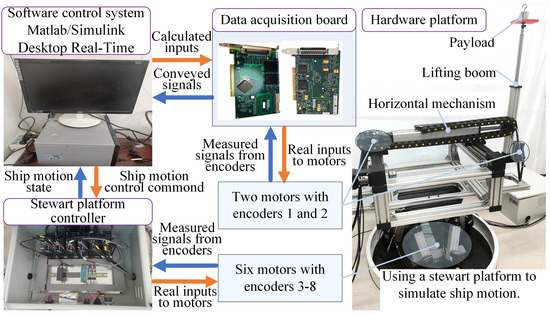 Experimental studies were carried out to further validate the control performance of the proposed control method in this section. The marine lifting system experiment platform is shown in Figure 12. The system parameters of the marine lifting system experiment platform and control gains are provided in Table 3. The lifting boom and horizontal mechanism are actuated by two servo motors with encoder 1 and encoder 2. The lifting boom displacement and horizontal mechanism displacement were measured by using the embedded encoders with servo motors. The control command was calculated using a PC with MATLAB R2021a software. The transmission of the control commands and the collection of the encoder data rely on the data-acquisition board. The Stewart platform was used to simulate the ship’s sway, heave, and roll motions caused by sea wave disturbances. The Stewart platform engages in communication with the PC via Ethernet.
