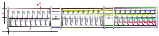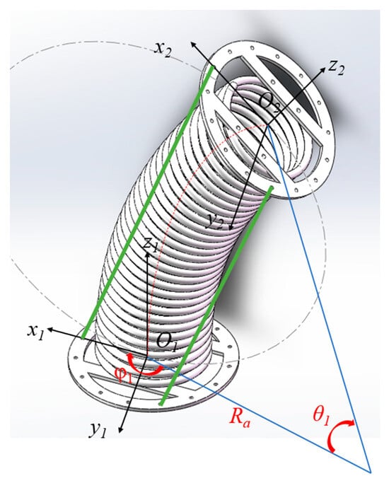 The structure of the cable-driven soft robotic arm is shown in Figure 1. The robotic arm mainly consists of three soft continuums, two cross gimbals, and six baffles, and each soft body and cross gimbal is driven by three cables, which are spaced 120° apart on the cloth cable disks. The driving cables are steel wire cables with diameter . The soft body is made of a nickel–titanium alloy spring with length . The radius from the center of the through hole to the center of the cloth cable disk is .