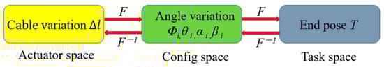 The kinematic mapping is solved by the piecewise constant curvature method and the D–H method. The mapping relationship between the three spaces of actuator space, configuration space, and task space is shown in Figure 2. The variable in the actuator space is the cable length . The variable in the configuration space is . Where is the angle of rotation of the soft joint, is the angle of bending, is the angle of rotation of the gimbal, and is the angle of bending, and the variable in the operating space is the end pose (x, y, z) of the robotic arm in the Cartesian coordinate system.