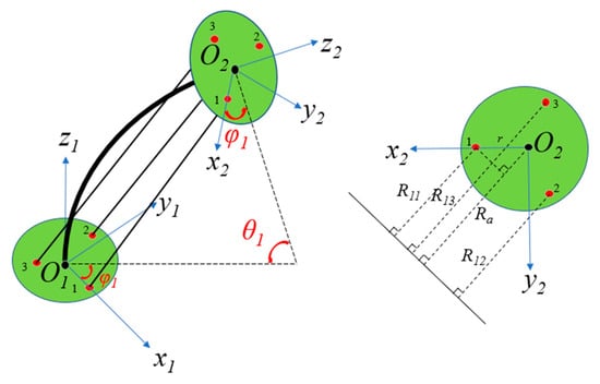 Inverse kinematics can solve the length of the rope when the end pose is known. First, the rotation angle and bending angle are obtained through the end pose, and then the length of the rope is obtained, so that the ideal pose can be achieved by controlling the cable. A schematic diagram of the bending of a single segment of the soft body is shown in Figure 4. are the bending radii of cables 1, 2, and 3 in the segment of the soft body, respectively.