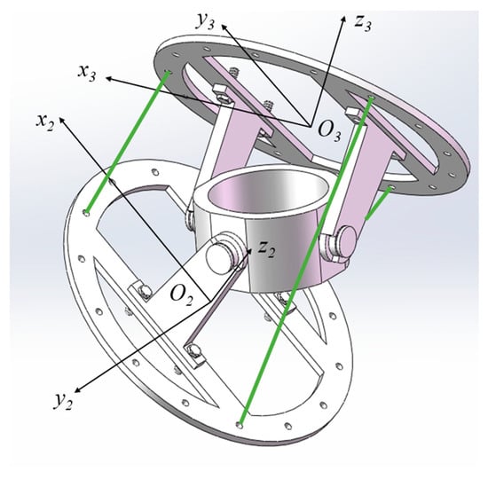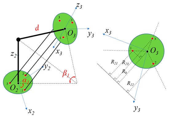 Where denotes the homogeneous transformation matrix from the coordinate system to the coordinate system . According to the homogeneous transformation matrix derived in the previous section and the “chain rule”, the expression of the homogeneous transformation matrix can be obtained as: