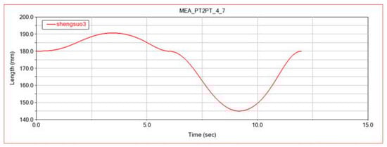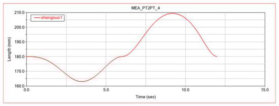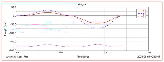 The simplified model of the single-segment soft body is set up and simulated by ADAMS, the simulation time is set to 12 s, and one cycle of reciprocating motion is performed in 12 s. The simplified model of the single-segment soft body is shown in Figure 9. The simulation results are shown in Figure 10 for the simulation results of the end pose, Figure 11 for the simulation results of the length of cable 1, Figure 12 for the simulation results of cable 2, and Figure 13 for the simulation results of cable 3.