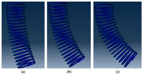 Experimental diagram of bending simulation. (a) When the force T = 5 N. (b) When the force T = 9 N. (c) When the force T = 15 N.