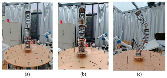 In order to objectively describe the operation of the soft robot arm, experiments and observations were carried out on the soft robot arm at the initial position (not working) and the fixed position (working). In the control system, 15 stepper motors were simultaneously driven to rotate the corresponding changing angles. The experimental results are shown in Figure 19, where a is the initial position, b is the front view, and c is the side view.