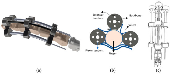 A series of three continuum robots like actuators are configured in a parallel arrangement to rehabilitate finger joints. Each actuator consists of three segments interconnected using hook and loop tape (HOLT) to form a triangular shape, as illustrated in Figure 1b. The use of HOLT facilitates the ease of application and adjustment for the patient. Each continuum robot as an actuator features a flexible additional backbone situated at its core. These backbones are not fixed to the rings. Their length between rings can increase or decrease. These backbones are just used to keep the rings aligned. The robot positioned at the apex of the triangular template is designed to assist with extension movements, while the other two continuum robots are responsible for assisting with flexion movements.