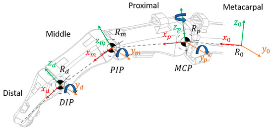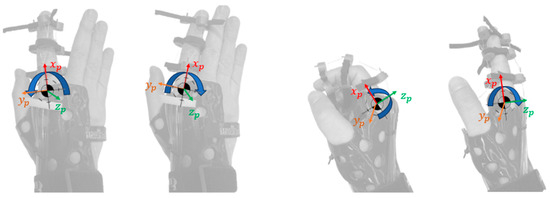 As shown in Figure 3 in the MCP joint, extension and flexion movements occur around the axis in clockwise and counterclockwise directions, respectively, while adduction and abduction occur around the axis in clockwise and counterclockwise directions, respectively. In the PIP joint, the finger bends through flexion and extends through extension, both occurring around the axis in a clockwise and counterclockwise direction, respectively. At the DIP joint, extension, which opens the finger, occurs around the axis in a clockwise direction, while flexion, which closes the finger, occurs in the opposite direction.