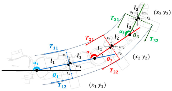 Using the equations of motion, the kinetic energies can be written for each joint as The equations are shown in Equations (5)–(7).