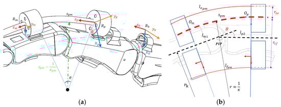 A discrete model represents the pose of the backbone. The finite backbone parameters are denoted by . Here, is the curvature of the backbone, is the angle between the bending plane and reference axis, and is the curve angle, as shown in Figure 6a. Here, the reference frame is just above the metacarpal bones and is described as . Also, is the length of the arc of the backbone between the proximal and middle phalanges. is the frame of the backbone fixed on the proximal phalange.