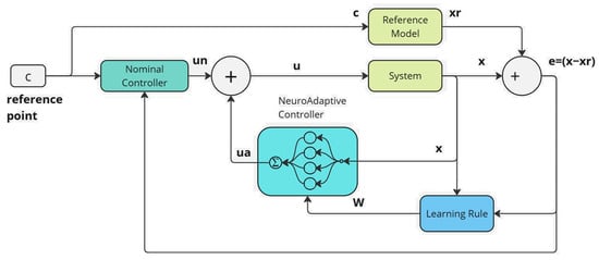 In Figure 9, the schematic of the proposed control algorithm is shown. Here, system dynamics are estimated by an RBF-based neural network online, and the obtained dynamics are used as an adaptive controller to regulate the error between the reference model and the state of the system. Additionally, there is a nominal controller () in the system.