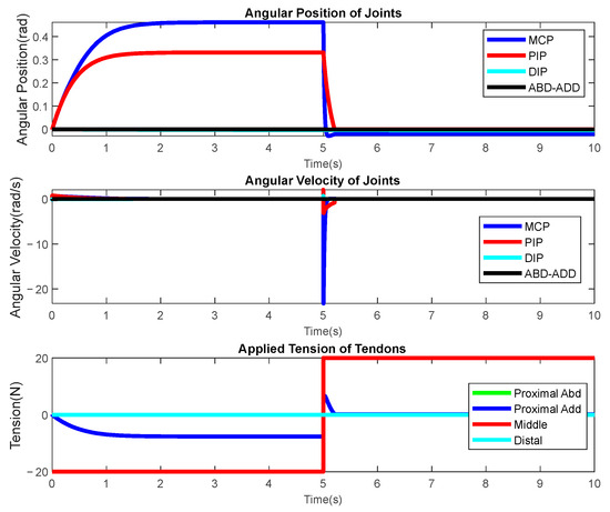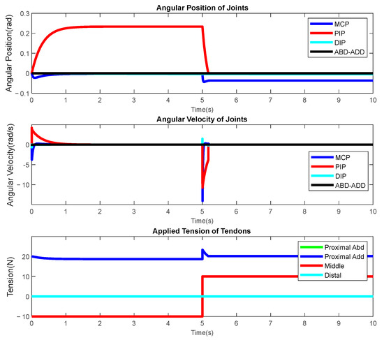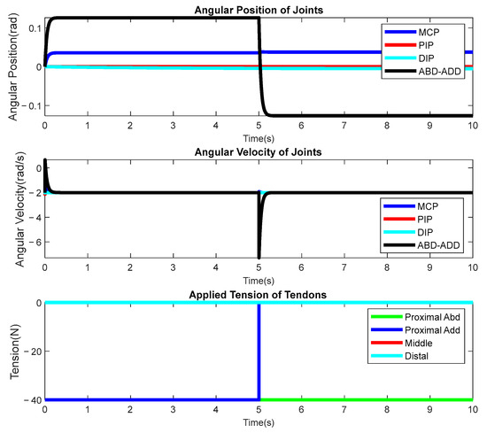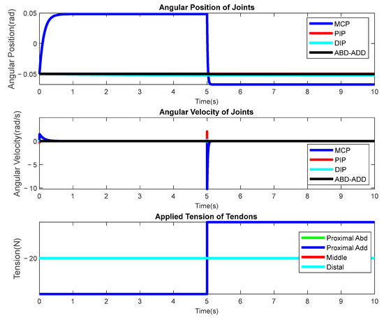 Individual experiments are used in this section to show an open-loop response of the multibody dynamic system. Figure 10 depicts an experiment in which tension is applied to the proximal tendons as both flexors and extensors. For this experiment, −40 N tension is applied to the proximal flexor tendons for the first five seconds of the simulation and then −40 N tension is applied to the proximal extensor while releasing tension on the flexor tendon for the second part of the simulation. The first and second graphics show 0 to 0.5-radian flexion movement caused by this action on the MCP joint.