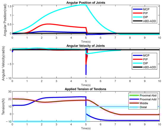 A similar experiment is conducted for the DIP joint, as shown in Figure 17. In this scenario, the influence of the distal tendon, which drives the DIP joint, on the other joints can be seen in the graphs. While a trajectory reference was given for the DIP, the other joints were given a reference of zero. The controller applied extension tensions in the middle and proximal tendons for the MCP and PIP joints to keep the other joints stable, as shown in Figure 17.