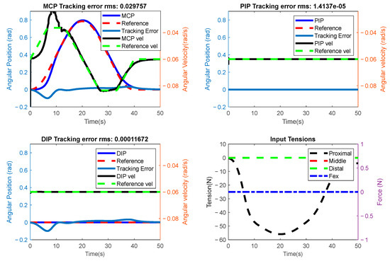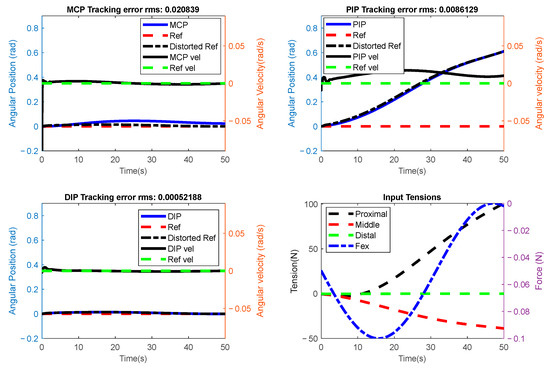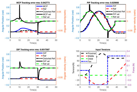 The results of the planned experiment for the active rehabilitation scenario are shown in Figure 20. As seen in Figure 20, a negative force was applied to the fingertip at the 10th second. The system is expected to respond adaptively to this force. As explained in the Section 2, the deviation of the trajectory calculated using external force () and a virtual mass-spring-damper system was added to the system’s reference. In Figure 20, a distorted reference can also be seen beside the reference in the graph titled PIP. This value shows the deviation produced by the mechanical system influenced by the external force.