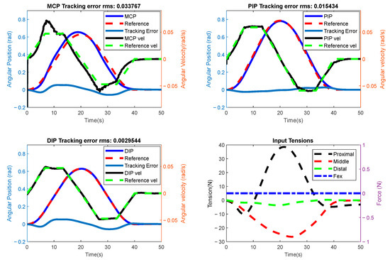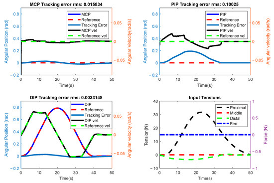 Table 2 provides the root mean square (RMS) values of the tracking errors for the overall evaluation of the controller’s performance in the simulation experiments. As shown in the table, for the MCP trajectory simulation experiment, the PIP and DIP joints are assumed to remain stationary at 0 degrees while the MCP joint tracks the given trajectory. The same scenario applies to the DIP and PIP trajectory experiments.