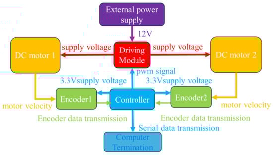 The drive system of the two-wheel differential car is symmetrically arranged, as depicted in Figure 1: an external power supply provides a voltage of 12 V to energize the driving module for propulsion. The DC motors on both sides are individually connected to the driving module to ensure autonomous operation. The encoder is powered by the controller with a 3.3 V power supply, continuously acquiring speed data from the DC motor during normal operations and transmitting the acquired data to the controller. The controller regulates the speed of the DC motor by generating a PWM waveform to control the driving module, while transmitting the received speed data to the computer terminal via the serial port.
